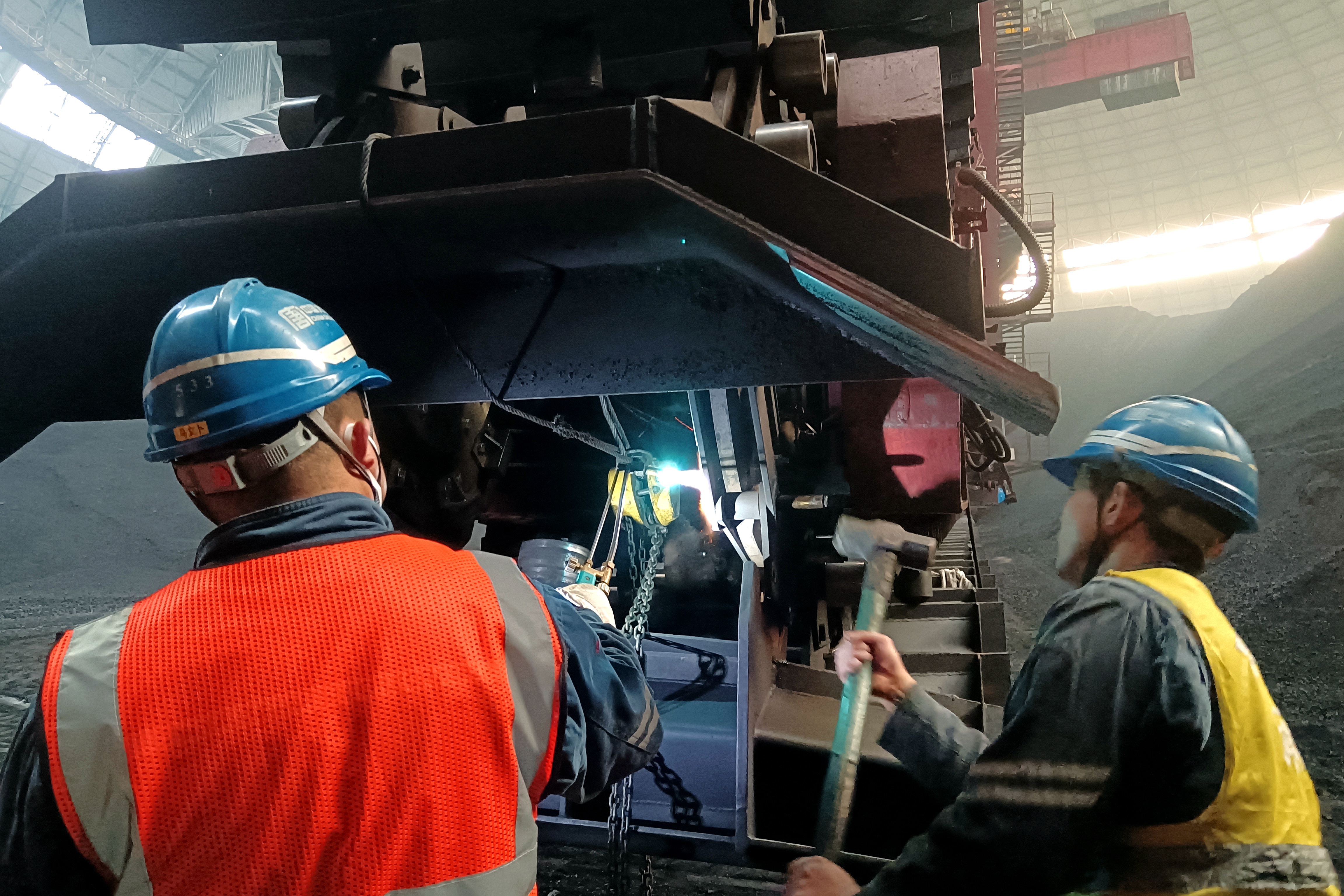 “咚……”圆形煤场传来有节奏的振打声,,,,,,,,一锤一锤的敲打声响彻整个煤场,,,,,,,,秦岭发电公司承揽富平热电维检事情的项目部输煤磨练职工们正在忙碌着。。。。。。。
